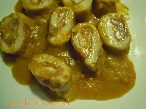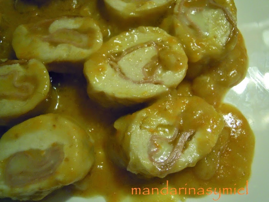 Corta en lonchas los rollitos y sirve acompañados de la salsa.