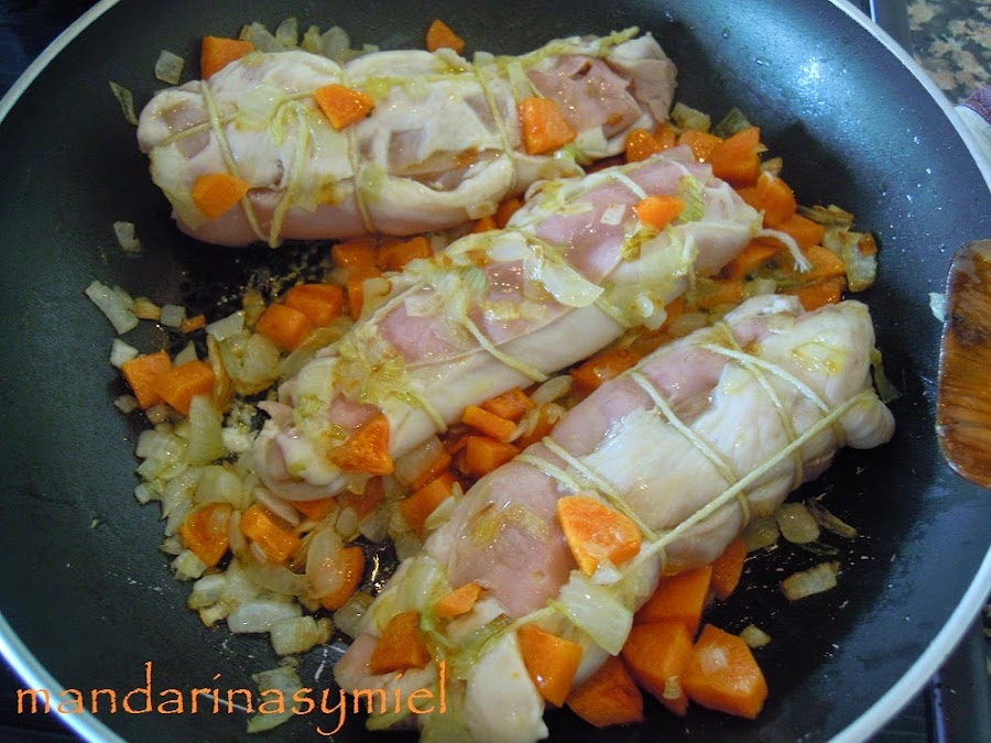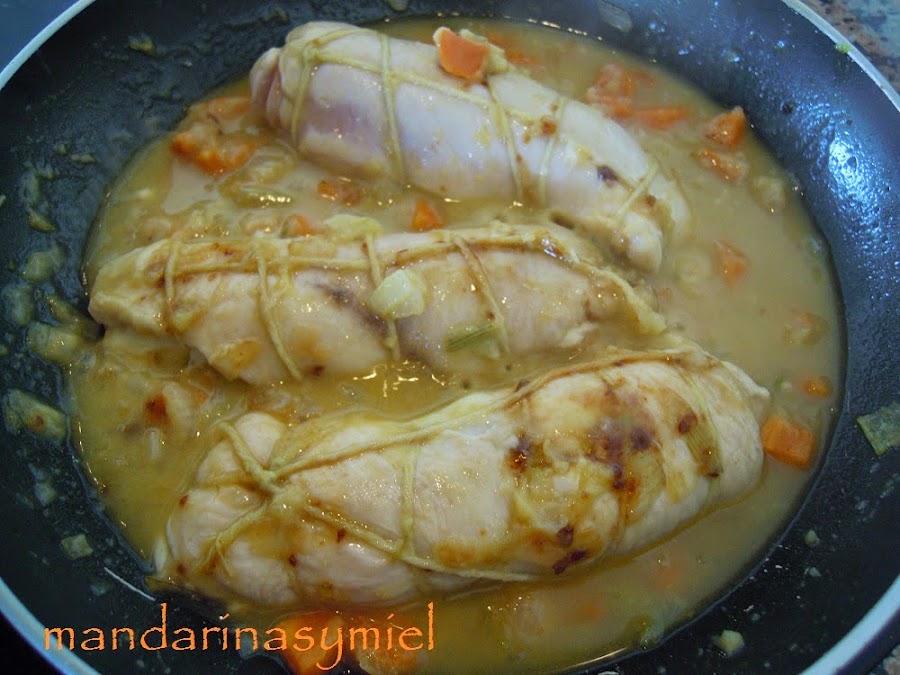 Añade los rollitos de pollo y dales unas vueltas, luego pon el vino y la pastilla de caldo y deja cocer unos 20 minutos.