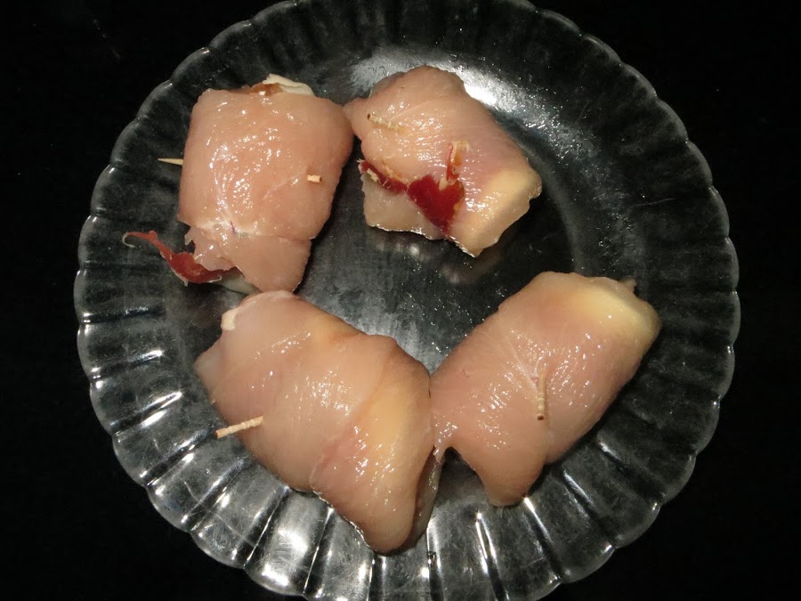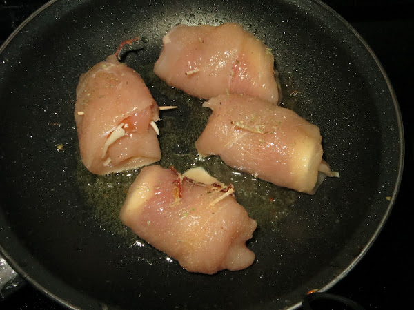 Lo primero que hacemos es estirar nuestros filetes de pechuga de pollo salpimentarlos por un lado y por el otro poner una loncha fina de jamón y otra de queso, doblamos y cerramos con un palillo. Echamos unas hierbas provenzales y el ajo granulado por encima para darle más color al pollo.