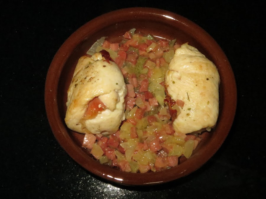 Mientras vamos preparando nuestra salsa, en la sartén donde hemos hecho el pollo añadimos la cebolla cortada en trozos pequeños, cuando veamos que comienza a aclararse añadimos el jamón, le damos varias vueltas para que tueste un poco y echamos el zumo del medio limón, la cucharada de mostaza, un chorro generoso de vino y otro de agua. Subimos el fuego para que se evapore el alcohol. Cuando tenemos la salsa casi reducida, echamos el pollo, que hemos sacado del horno (no olvidéis quitarle el palillo), le damos varias vueltas y ya está listo para servir.