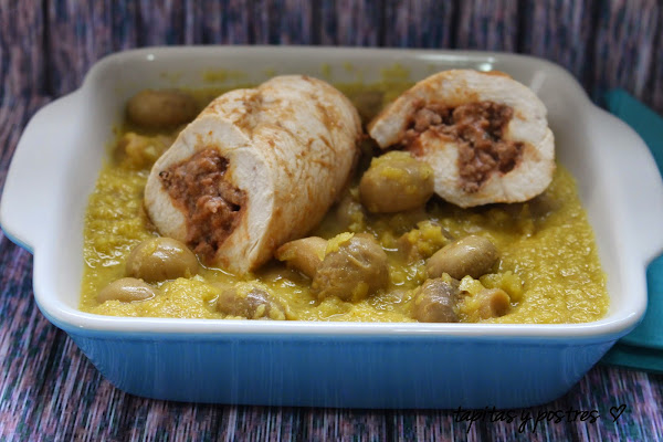 Esta semana tocaba pechugas de pollo rellenas, y yo me he salido de la receta original y he preparado estos rollitos a mi manera.