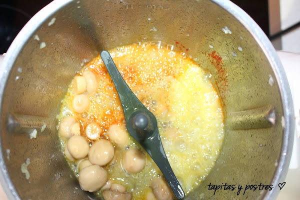 Al acabar, retiramos el varoma con cuidado. Ponemos la mariposa y agregamos en el vaso, los champiñones, la cerveza y el azafrán y volvemos a colocar el recipiente varoma. Programamos 15 minutos, varoma, giro a la izquierda y velocidad 1.