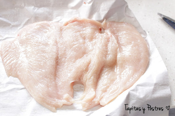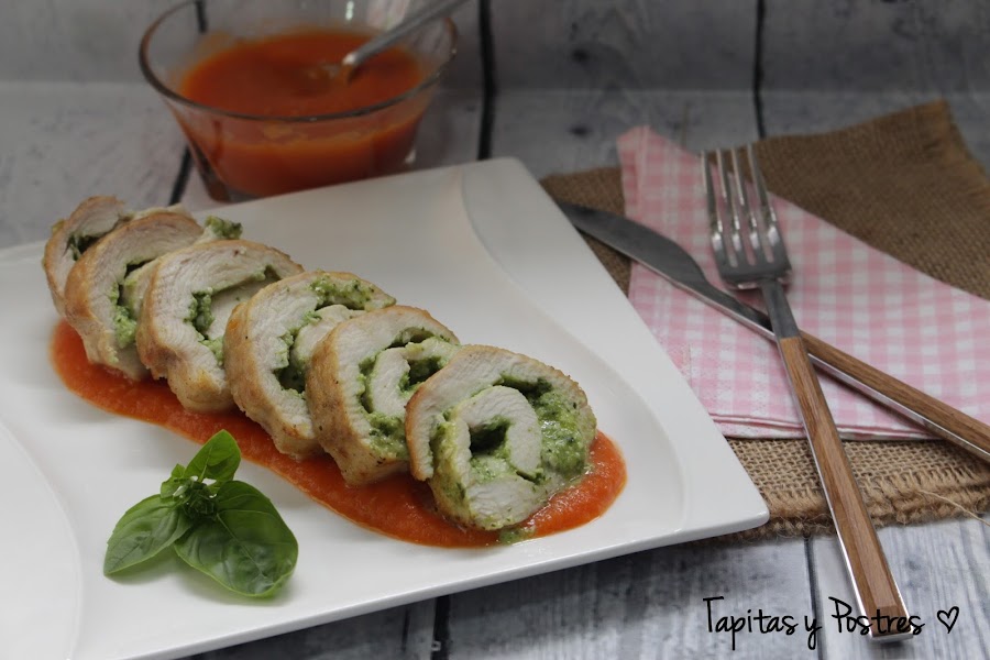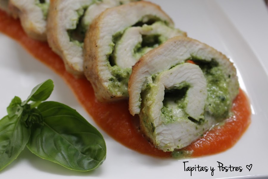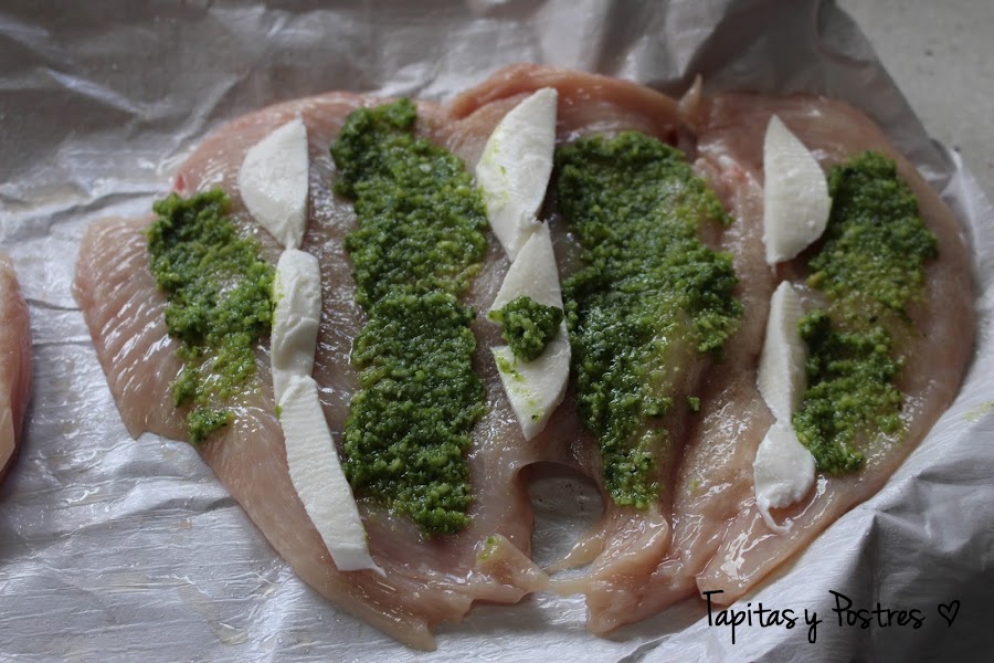 Primero deberemos elaborar las salsas que acompañan a esta receta, la salsa pesto y la salsa de tomate (ver enlaces de preparación arriba). Salpimentamos la pechuga abierta por los dos lados. Colocamos una cucharadita de pesto encima alternándola con lonchitas de mozzarella.