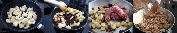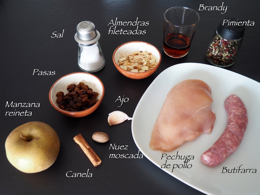 Colocar una sartén al fuego y calentar un par de cucharadas de aceite. Sofreír ligeramente la manzana. Incorporar el ajo. Escurrir las pasas y reservar el brandy.