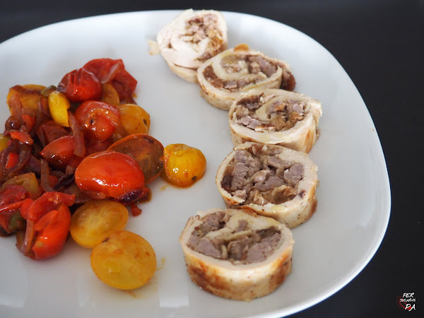Al servir cortar en rodajas de unos dos centímetros más o menos. Se puede acompañar con todo lo que se te ocurra, nosotros os proponemos unos tomatitos de colores pochados al fuego con un poco de cebolla.