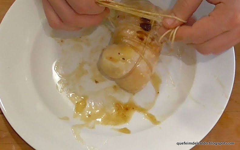 Hoy hemos rellenado unas pechugas de pollo con jamón cocido y queso, la manera de hacer estos rollos es muy fácil. En primer lugar se abre la pechuga de pollo hasta dejar una hoja, en ese momento se ponen lonchas de jamón cocido y queso, enrollamos y sellamos con la ayuda de una cuerda.