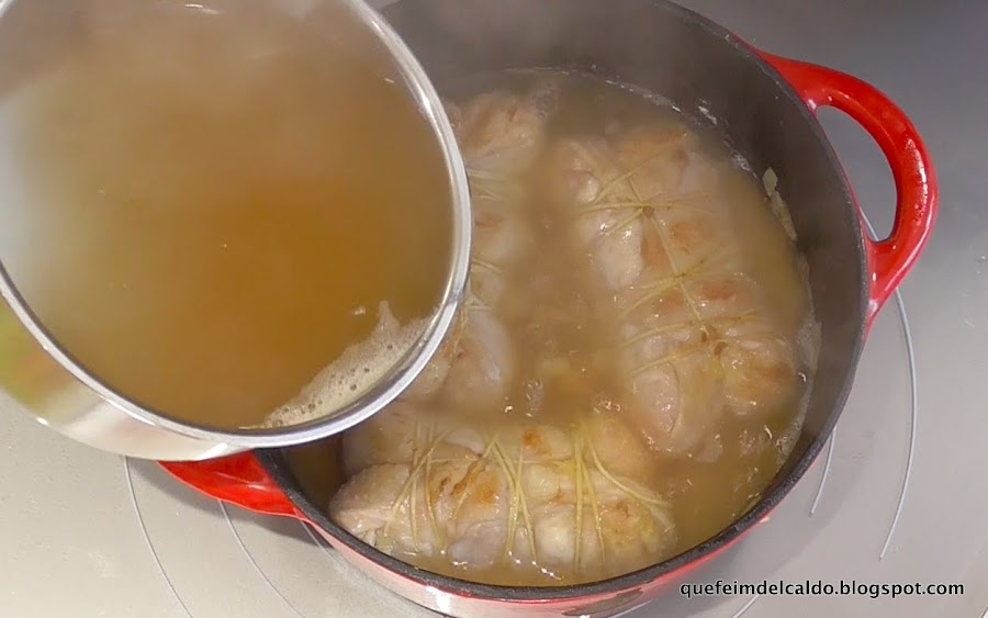 Incorporamos los 400 ml. de caldo de pollo y dejamos cocinandose durante 25 minutos a temperatura de fuego 6-9, cada 10 minutos le damos la vuelta a los rollitos.