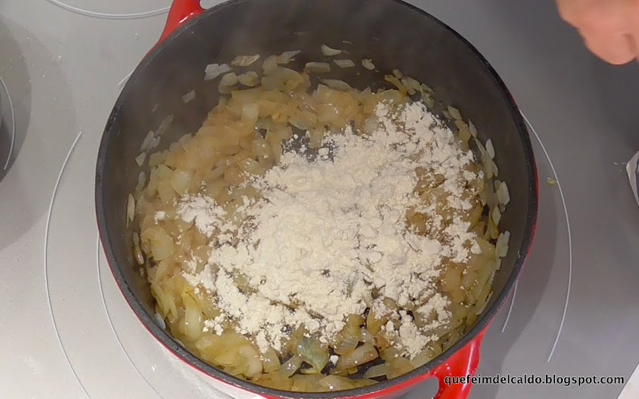 Una vez pochada y transparente la cebolla añadimos una cucharada de harina sopera, removemos para juntar todo.