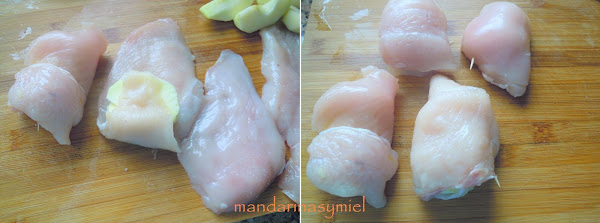 Forma rollitos envolviendo los gajos de manzana con los filetes de pollo, cierralos con palillos.