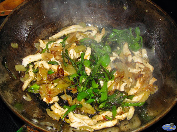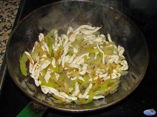 Cortamos la pechuga de pollo en tiras y el calabacín ,los pimientos y la cebolla en juliana. Yo puse unos 15 pimientos y le quité casi todas las pepitas para que no fuera demasiado heavy...jeje