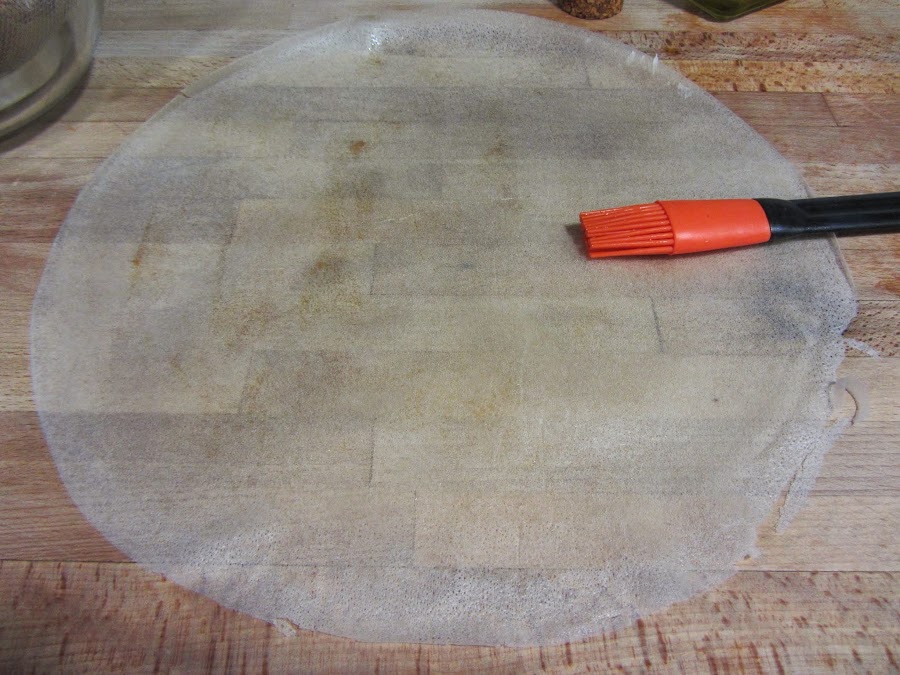 Una vez que esté templado o frío el relleno, preparamos los rollitos. Untamos primero cada lámina de pasta brick con una gotita de aceite.