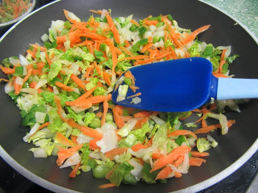 Rehogamos, en un wok o sartén honda, con un chorrito de aceite, las verduras, durante 5 minutos, a fuego medio-fuerte. Queremos que nos queden crujientitas.