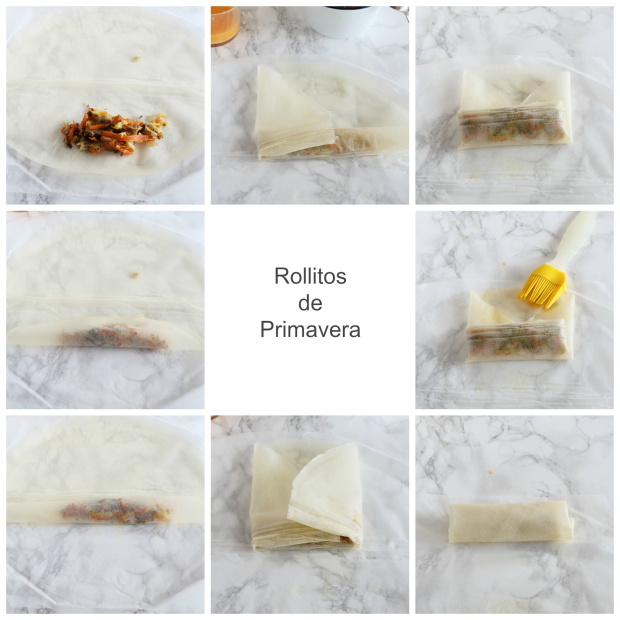 Extendemos la pasta brick, ponemos el relleno en uno de los extremos, enrollamos hasta la mitad, cerramos los dos extremos hasta el centro y seguimos enrollado.