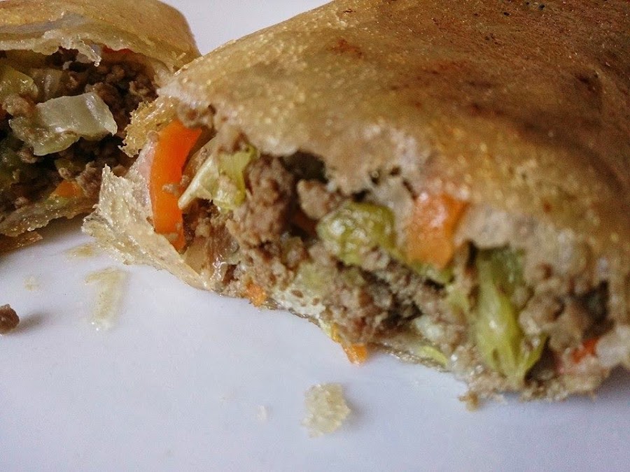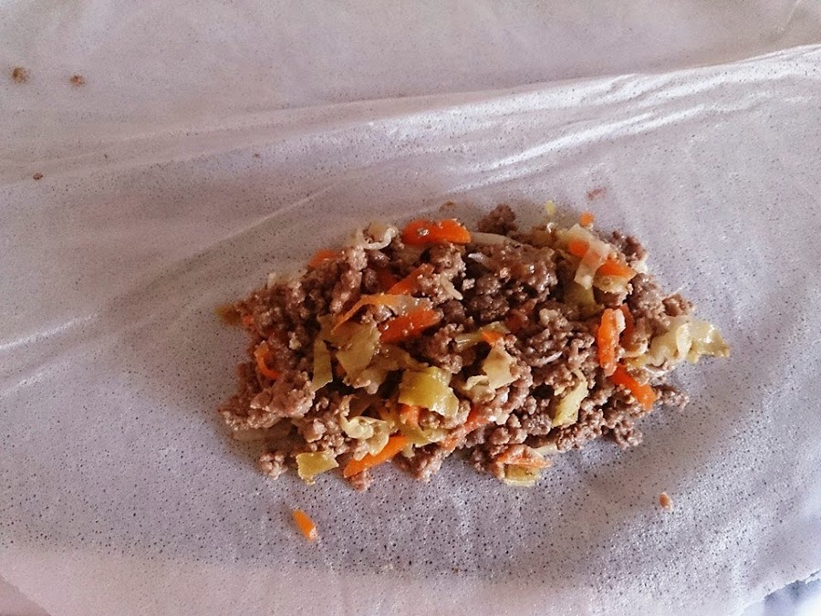 Cortar la col y la zanahoria en juliana muy finita, poner a pochar con un poco de aceite. Picar muy finito el diente de ajo y agregar. Echar la carne picada y la sal. Mover todo bien y cocinar hasta que se quede en el aceite. Dejar enfriar.