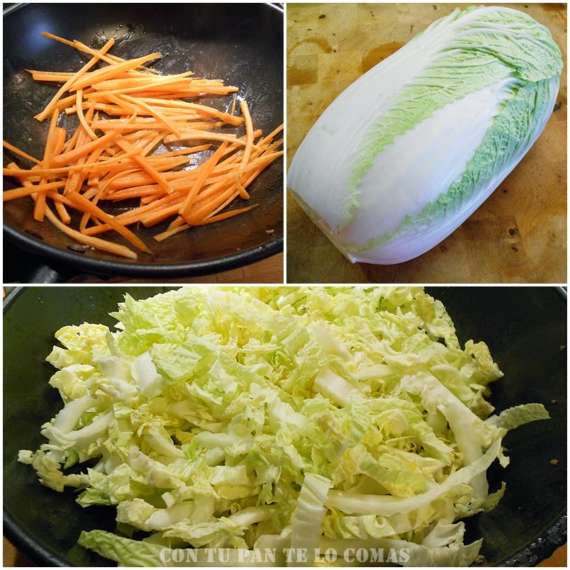 3. Añadimos la col china en tiras finas y dejamos hacer sólo un par de minutos porque esta col es muy tierna y enseguida se hace. Si no la encuentras puedes ponerle col o repollo normal.