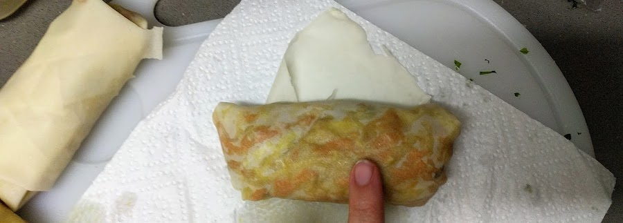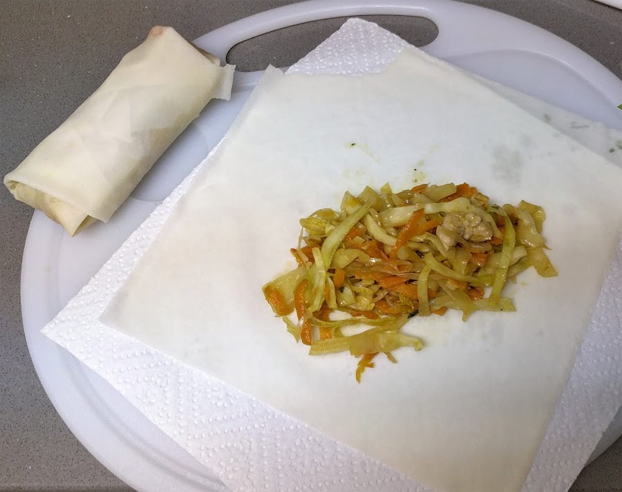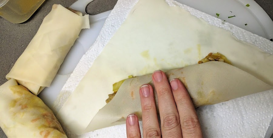 A continuación mostramos los pasos visualmente para hacer los rollitos. Hay que coger una buena cucharada o dos de relleno y una vez creado el rollito sellar con huevo batido.