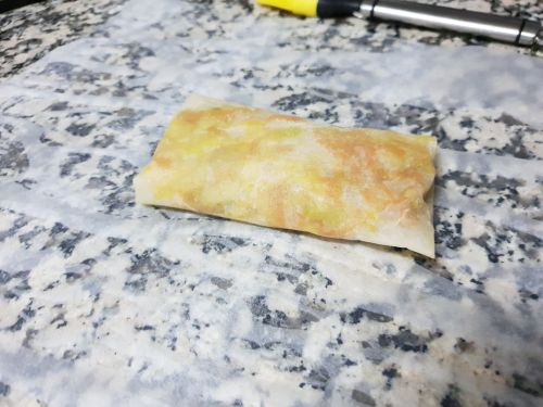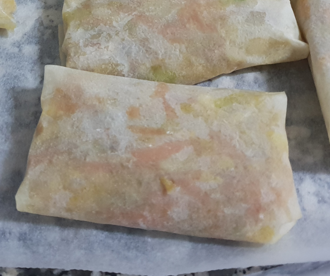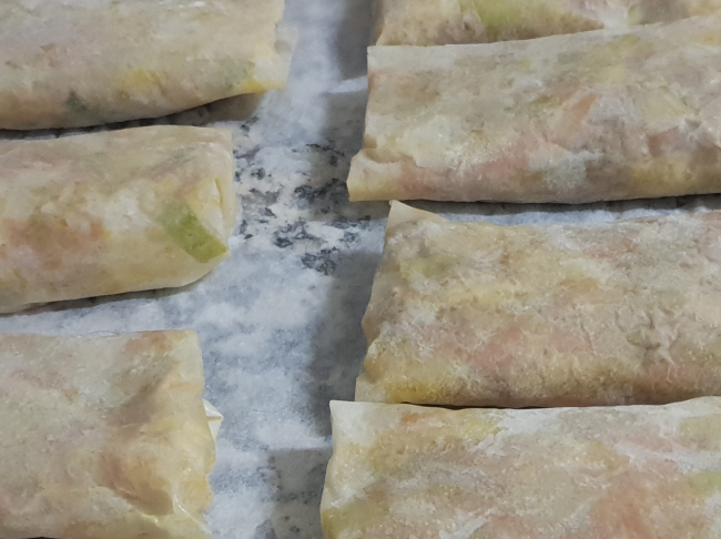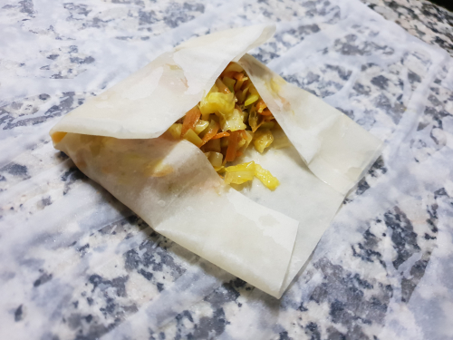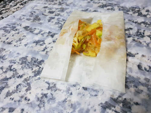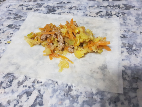 En cada trozo ponemos 3 cucharadas de relleno, o de verduras o de verduras con carne. Y cerramos el rollo haciendo un paquetito.