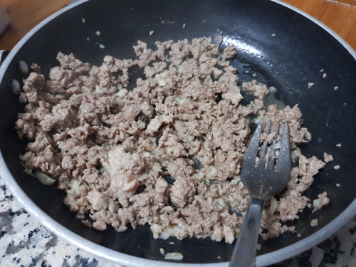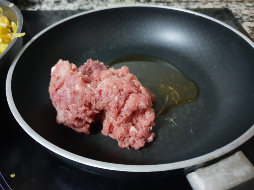 Añadimos otro chorrito de aceite a la sartén y una vez caliente añadimos la carne picada.