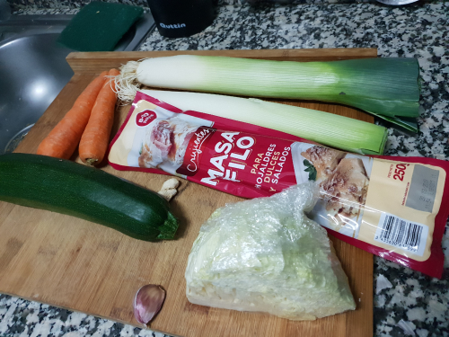 Abrimos el paquete de masa filo y cogemos 2 hojas, el resto las mantenemos tapadas para que no se sequen.