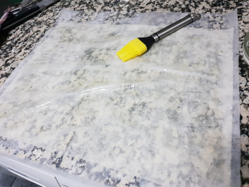 Con ayuda de un pincel pintamos con aceite una de las hojas y ponemos la otra encima.