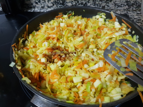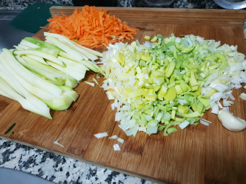 Empezamos cortando las verduras, la zanahoria se ralla con el rallador, la col en juliana y el calabacín en cuadraditos.