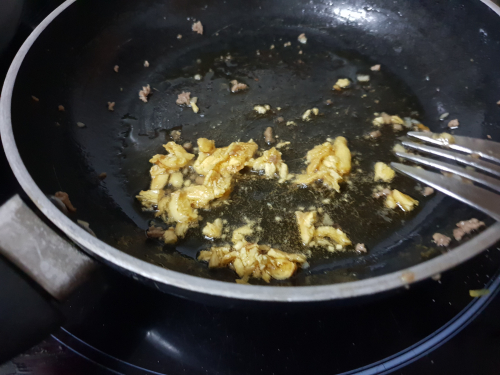 Cocinamos hasta medio hecha añadimos en un lado el ajo picado, terminamos mezclando todo, quitamos del fuego y reservamos.