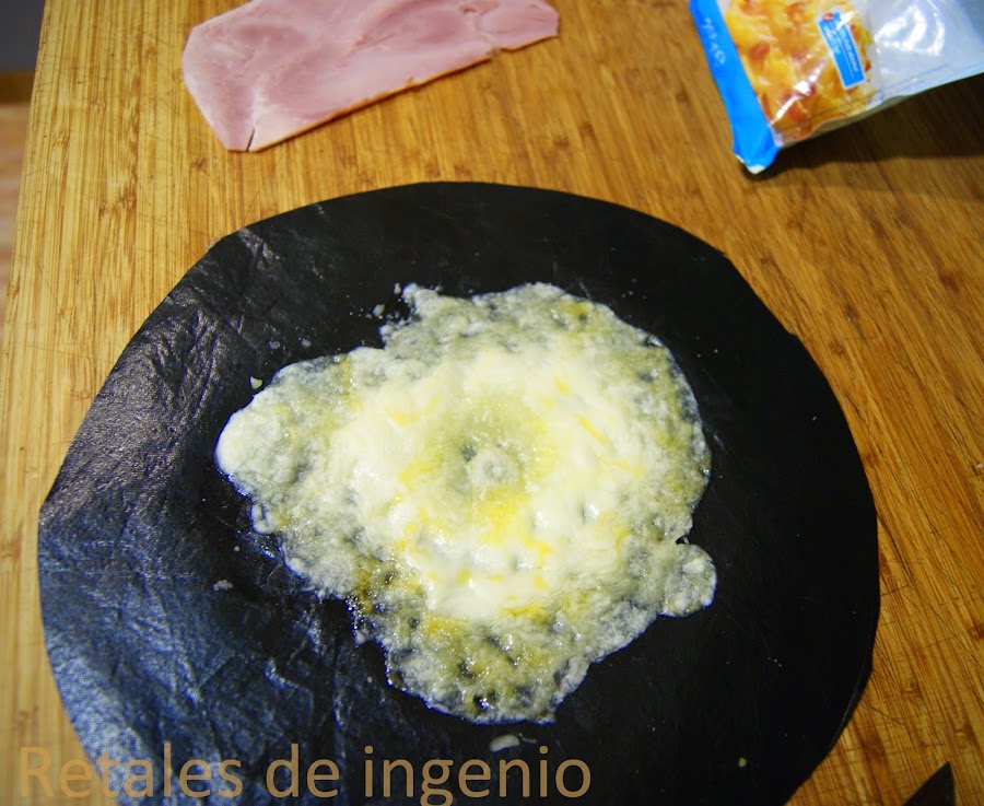 Extender un puñado de queso rallado sobre una lámina de teflón o papel de horno y fundir un minuto en el micro. También se puede hacer en horno convencional pero emplearéis mas tiempo o sobre una sartén poniendo la lámina de teflón encima para poder despegarlo mejor. Yo recorté una con forma redonda y la empleo para estos casos.