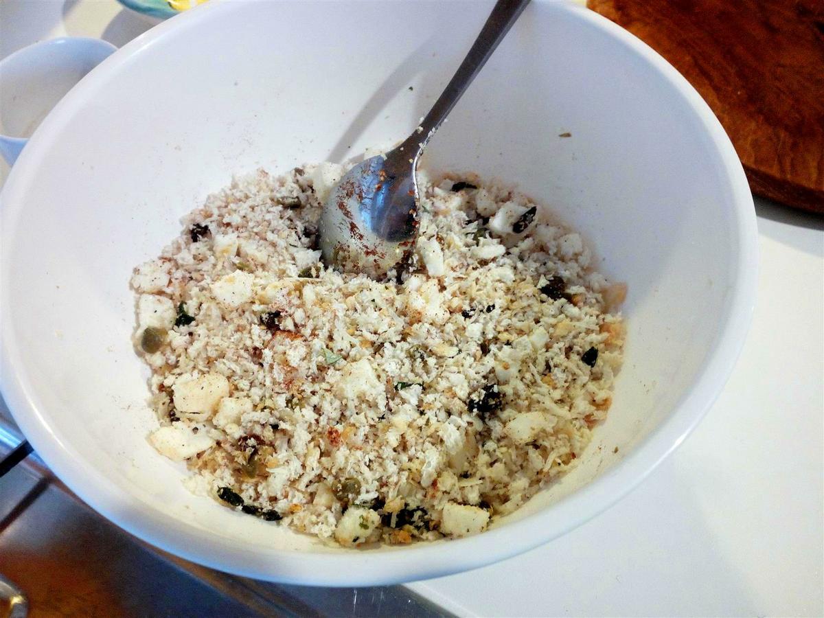 Poner las uvas pasas en agua temblada durante unos minutos. En una bol, poner las migas de pan, mozzarella en taquitos, queso parmesano rallado, alcaparras y uvas pasas picadas, menta y condimentar con sal, pimienta, pimentón y aceite EVO de Tercio de las Torres.