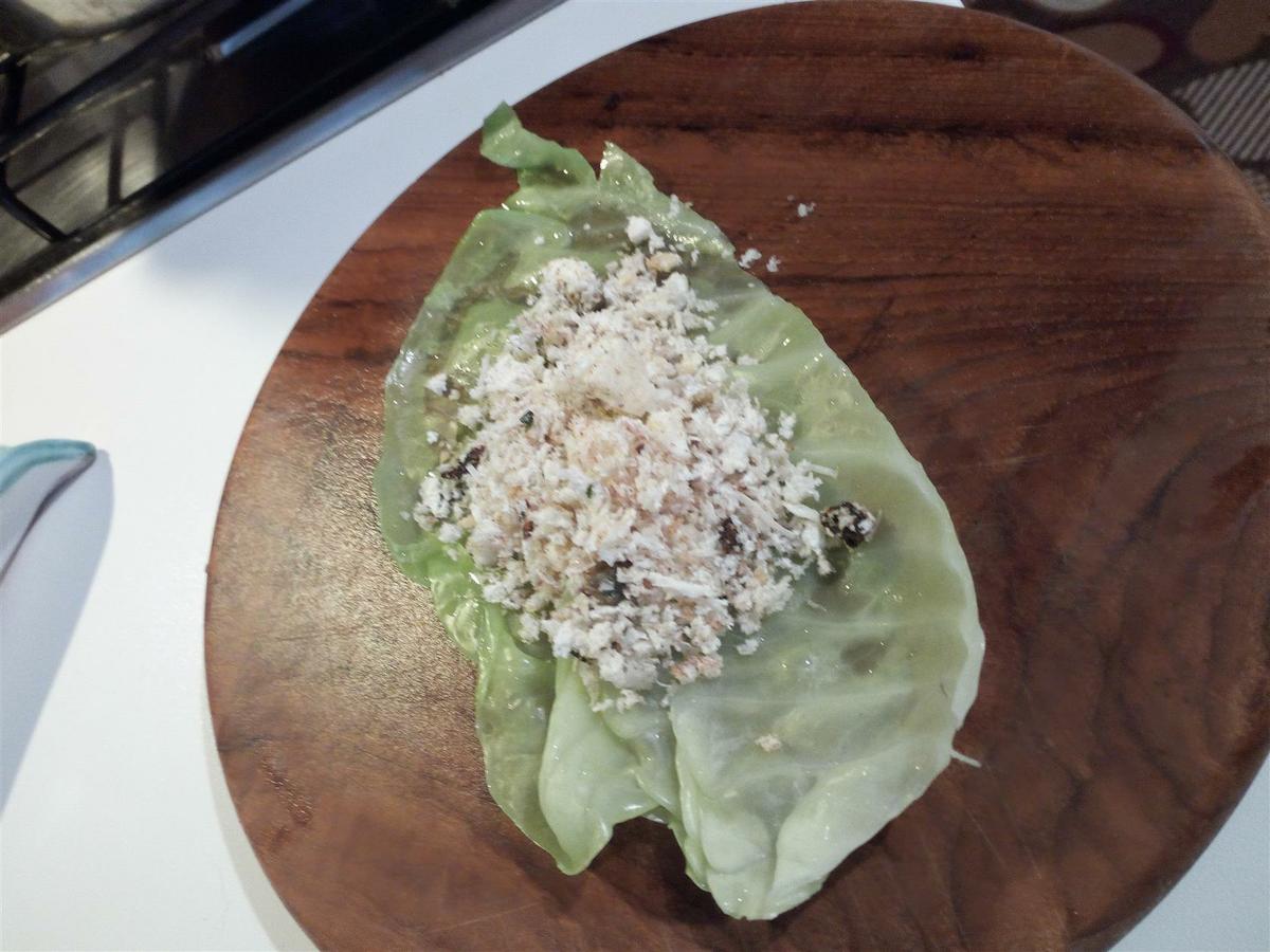 Mezclar todo y extender una hoja de repollo: rellenar con el compuesto y cerrar.