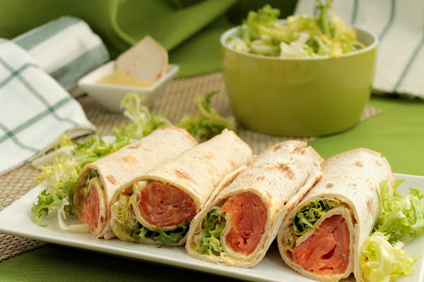 No digáis que no son bonitos y maravillosos estos rollitos de salmón ahumado. Son ideales para una cena informal cuando viene visita. O una fiesta, para servirlos en la mesa y la gente se los coma con la mano. Mirad qué corte más estupendo con mi truquillo para enrollar en general todos los burritos que lleven dos ingredientes distintos. Y es colocar el salmón ahumado en un extremo de la tortilla de trigo (un par de láminas de salmón ahumado para que quede bien relleno) y darle una primera vuelta enrollando la tortilla sobre el salmón, y luego rellenar el resto de la tortilla con la lechuga escarola rizada, ya bien cortadita en trozos pequeños y lavada, y continuar enrollando hasta acabar. Y así conseguimos este efecto súper chulo que parece que están separados el salmón ahumado y la lechuga escarola.