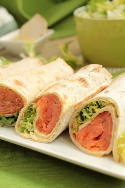 3. Colocamos dos láminas de salmón ahumado en el borde de la tortilla de trigo más cercano a nosotros.