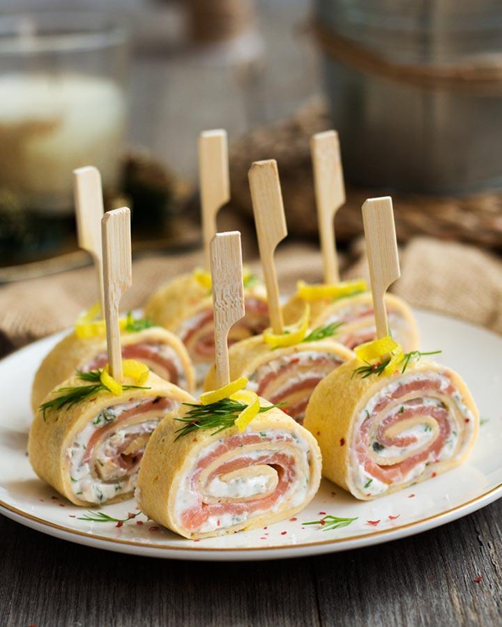 Corta el rollo en porciones con un cuchillo bien afilado. Coloca un palillo en cada rollito y sirve en una bandeja. Decora cada rollito con unas hojas de eneldo, un poco de ralladura de limón y un chorrito de aceite de oliva.