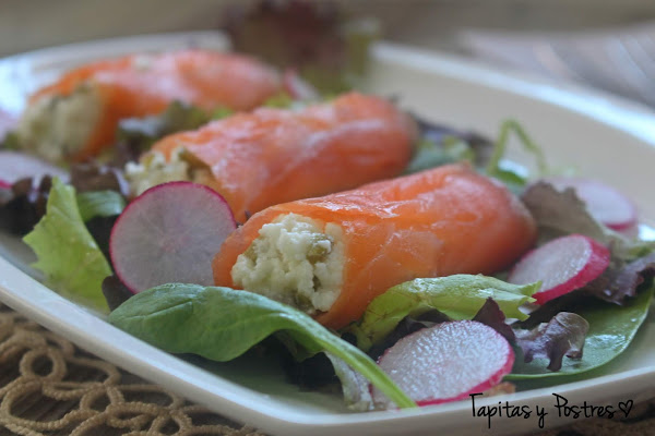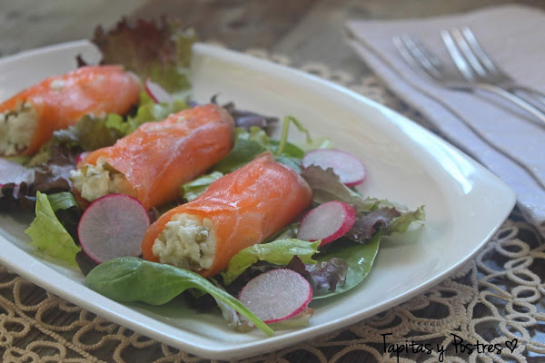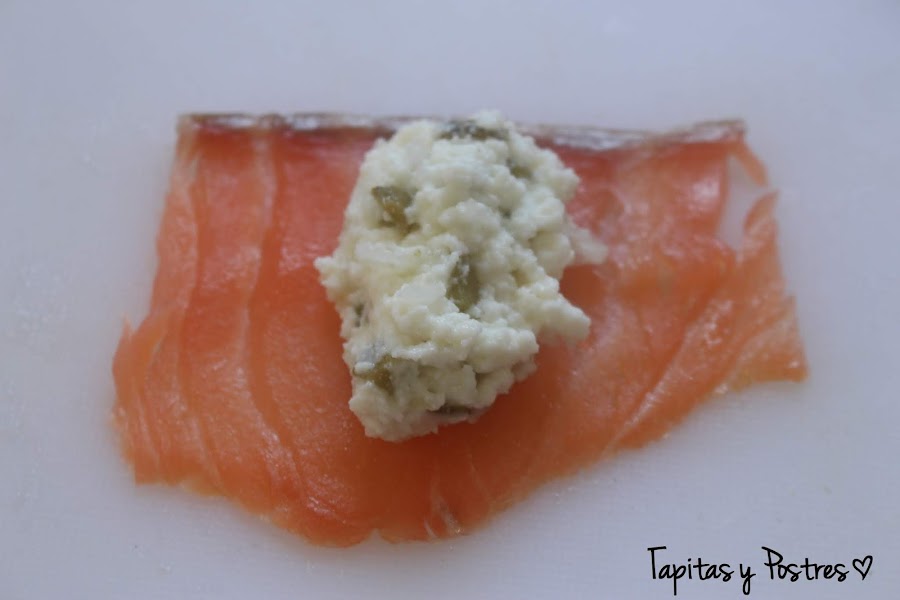 Ponemos las lascas de salmón extendidas, colocamos una cucharada del relleno y enrollamos.