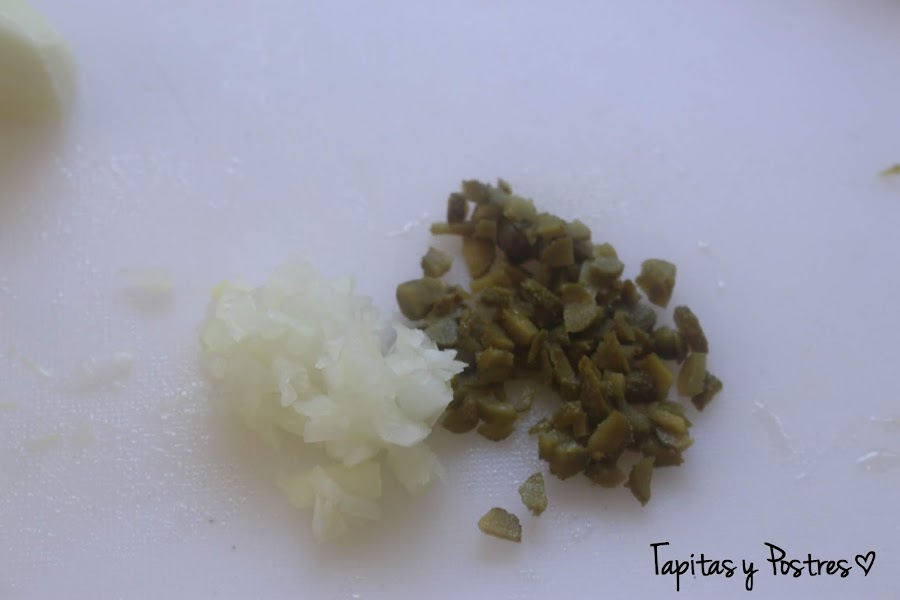 Picamos muy pequeñita la cebolla y los pepinillos. Lo mezclamos con el requesón y sazonamos con pimienta. Revolvemos bien.