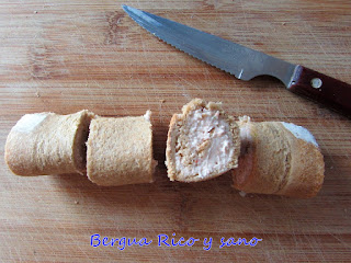 6. Justo antes de dar el rulo por terminado, extendemos el exceso de paté en el último centímetro de pan donde no habíamos untado nada; funcionará como pegamento.