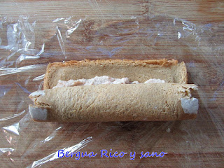 5. Como al hacer sushi, tenemos que rular el pan sobre sí mismo de forma que quede prieto; a mí me ayuda poner la rebanada sobre un trozo de papel transparente de cocina y con él empiezo a rular; de ahí ya sigo con las manos.