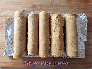 7. Realmente los rulos se pueden comer tal cual a bocados; seguro que a los niños les encanta la idea; pero si quieres servirlo en plan picoteo/tapeo y sacarlo a la mesa de forma más fina, haremos los rollitos: