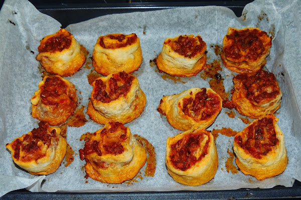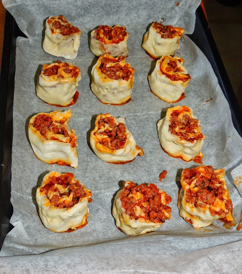 En este momento se pueden untar con huevo batido, pero no es necesario debido a que la ternera ya lleva aceite y el hojaldre se quedará dorado igualmente. A continuación se mete al horno y se deja unos 20 minutos.