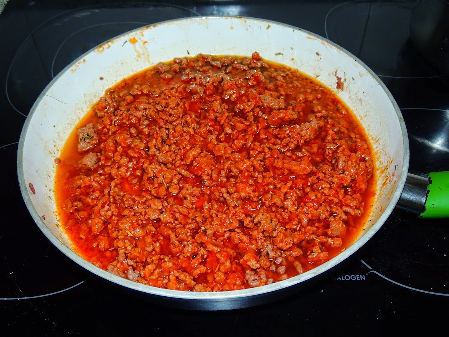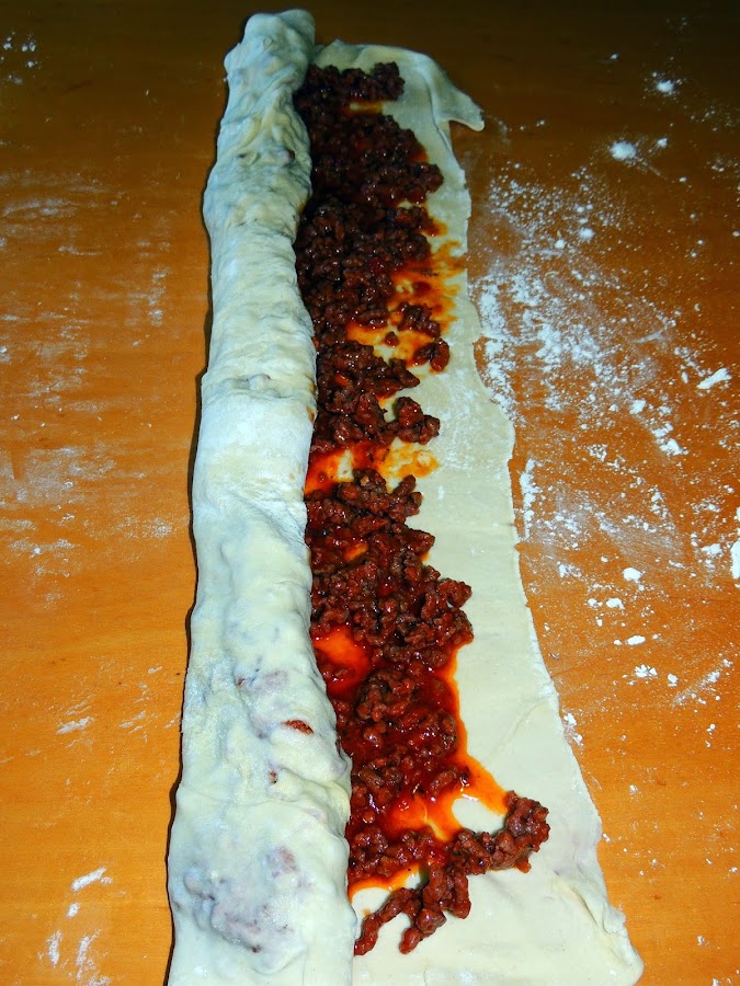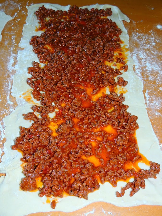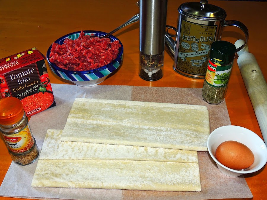 300 gr. de ternera picada, 6 cucharadas de tomate frito tipo casero, un huevo (opcional), aceite de oliva, una placa de hojaldre descongelado, sal, pimienta, hierbas provenzales, semillas de sésamo y harina.