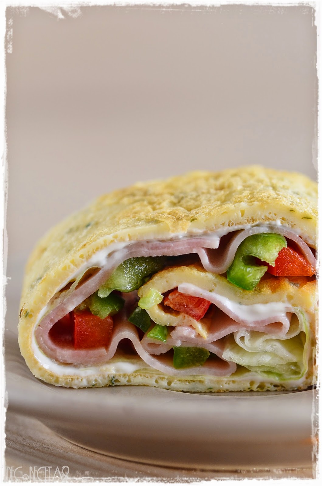 Así que esta receta es una tortilla francesa rellena, pero diferente. Variando parte de los ingredientes que habitualmente ponemos y presentando de manera vistosa