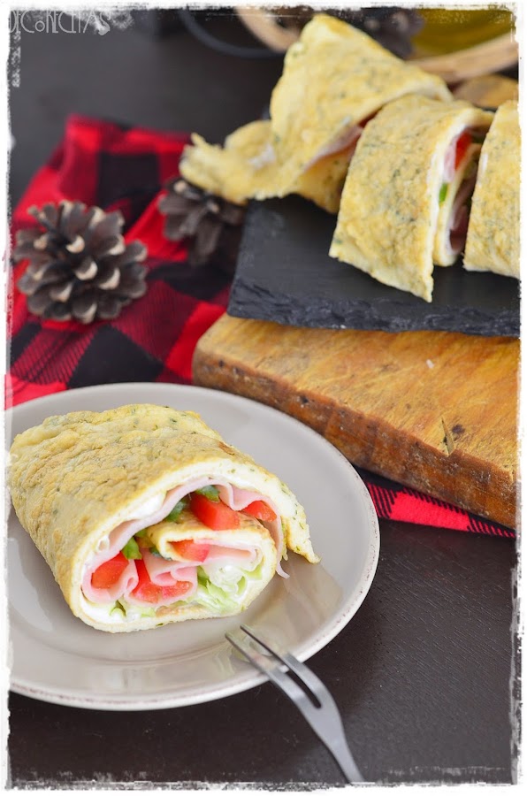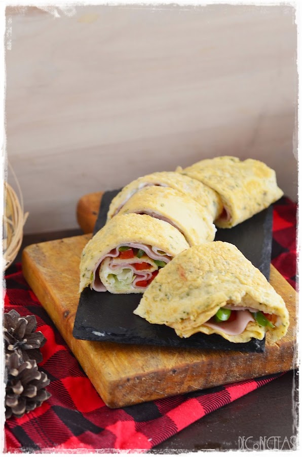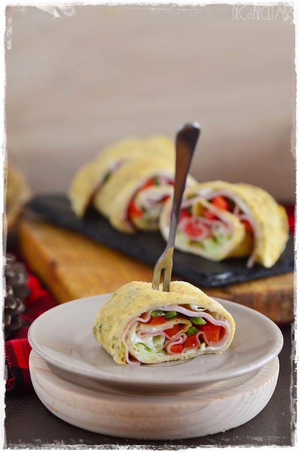 Hacemos unas tortillas francesas, eso sí, más finitas de lo normal, tipo crep para que no tener dificultad al enrollar. Las untamos de queso crema, y disponemos encima los ingredientes elegidos: jamón cocido, lechuga y pimento. Enrollamos con cuidado, y envolvemos en film transparente como si se tratase de un caramelo. Recomendable dejar en la nevera unas horas antes de su consumo para que la forma no se desmorone, o si es así, pondremos unos palillos encima.
