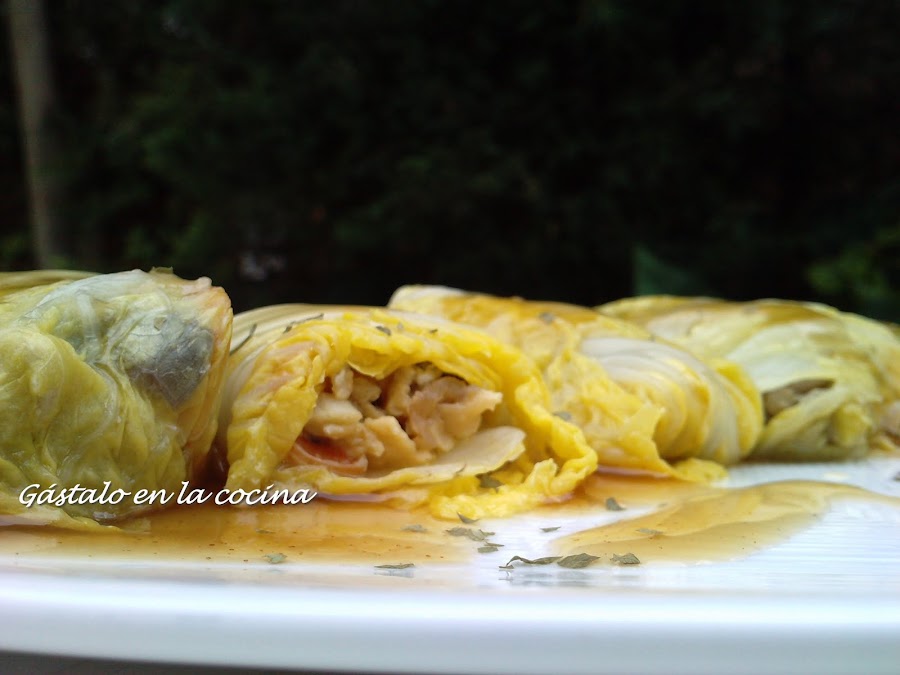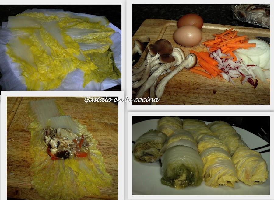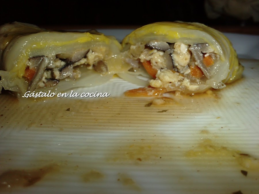 Ahora montamos los rollitos: estiramos las hojas y en el centro ponemos un poco del sofrito, cerramos bien y los ponemos en una sartén para darles un golpe de calor.