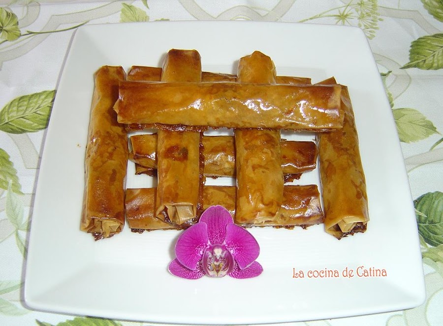 Extendemos la masa filo, cortamos en seis porciones iguales, con dos hojas por corte y después pincelamos toda la superficie con mantequilla derretida.