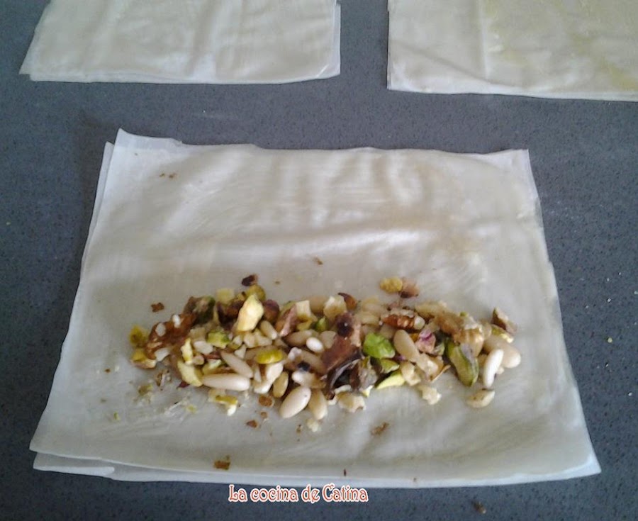 Por último, los ponemos en la masa, comenzando por los lados, para que los frutos no resbalen, y después los enrollamos como si fueran un puro.