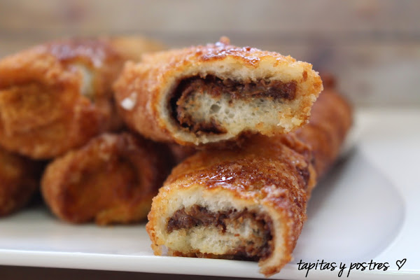 Pero esto no me ha detenido y con unas rebanadas de pan de molde y un bote de nutella he preparado estos rollitos que han caído rápidamente.