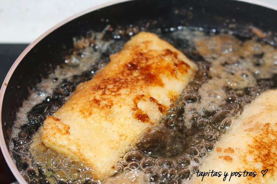 Y los freímos en abundante aceite caliente. Hasta que los veamos dorados. Al sacarlos, no los pongáis sobre papel absorbente pues se pegarán.