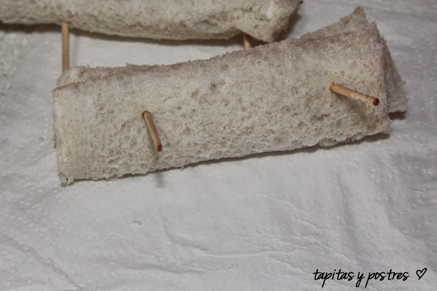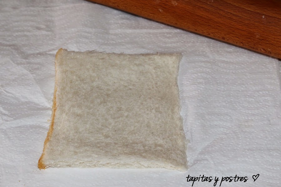 Aplanamos las rebanadas de pan de molde con un rodillo (previamente le quitamos los filos)