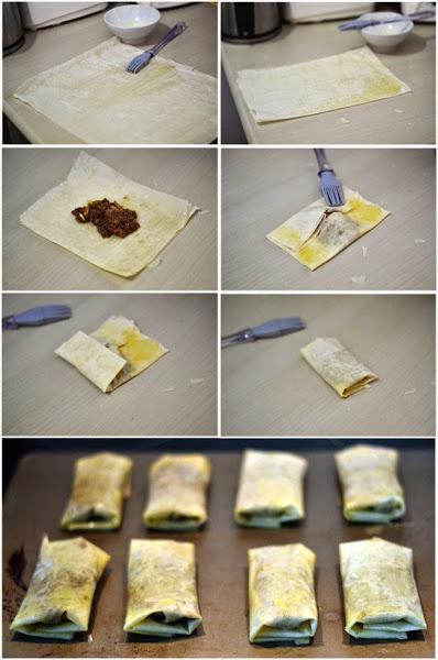 El procedimiento es sencillo, mecánico y entretenido: consiste en pincelar ligeramente la lámina de filo con mantequilla y doblar juntando los bordes más cortos de la pieza, repitiendo el proceso una vez más. Esto te va a dar cuatro capas muy crujientes que contendrán el relleno, si las matemáticas no me fallan.