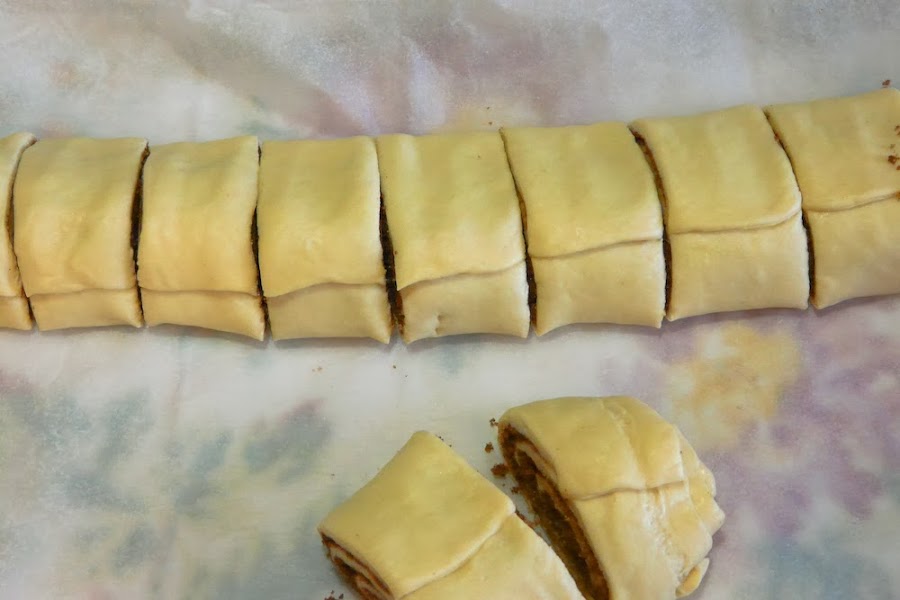 Enrollar la masa y cortar en trozos de unos 2 dedos de grosor.A mi me salieron 12 rollitos.