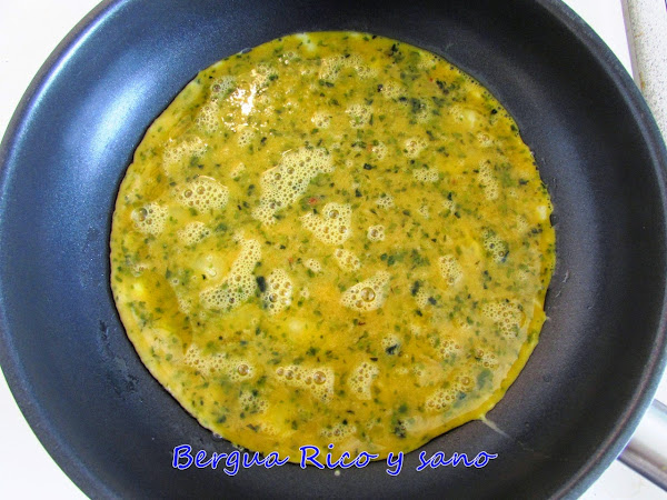 2. Calentamos un poco de aceite en una sartén mediana, de unos 24 cm de diámetro y hacemos una tortilla francesa por los dos lados y procurando que nos quede uniforme y redonda.
